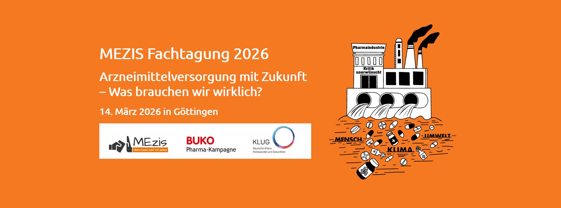 Die gemein­sa­me Fach­ta­gung von MEZISBUKO Phar­ma-Kam­pa­gne und KLUG – Deut­sche Alli­anz Kli­ma­wan­del und Gesund­heit bringt Akteur:innen aus Medi­zin, Phar­ma­zie sowie zivil­ge­sell­schaft­li­chen Initia­ti­ven zusam­men, um gemein­sam über eine zukunfts­fä­hi­ge Arz­nei­mit­tel­ver­sor­gung zu dis­ku­tie­ren. Im Fokus ste­hen Umwelt­wir­kun­gen von Medi­ka­men­ten, Über­the­ra­pie, nach­hal­ti­ge Pro­duk­ti­on, res­sour­cen­scho­nen­de Ver­ord­nung und Best-prac­ti­ce-Bei­spie­le aus ande­ren Län­dern. Wie kann uns eine Umset­zung in Deutsch­land gelin­gen? Wel­che Hebel haben wir – indi­vi­du­ell, insti­tu­tio­nell und poli­tisch?